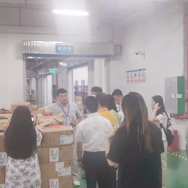 工作人員帶領考察團參觀入駐企業(yè)的倉儲區(qū),了解倉儲運營流程。